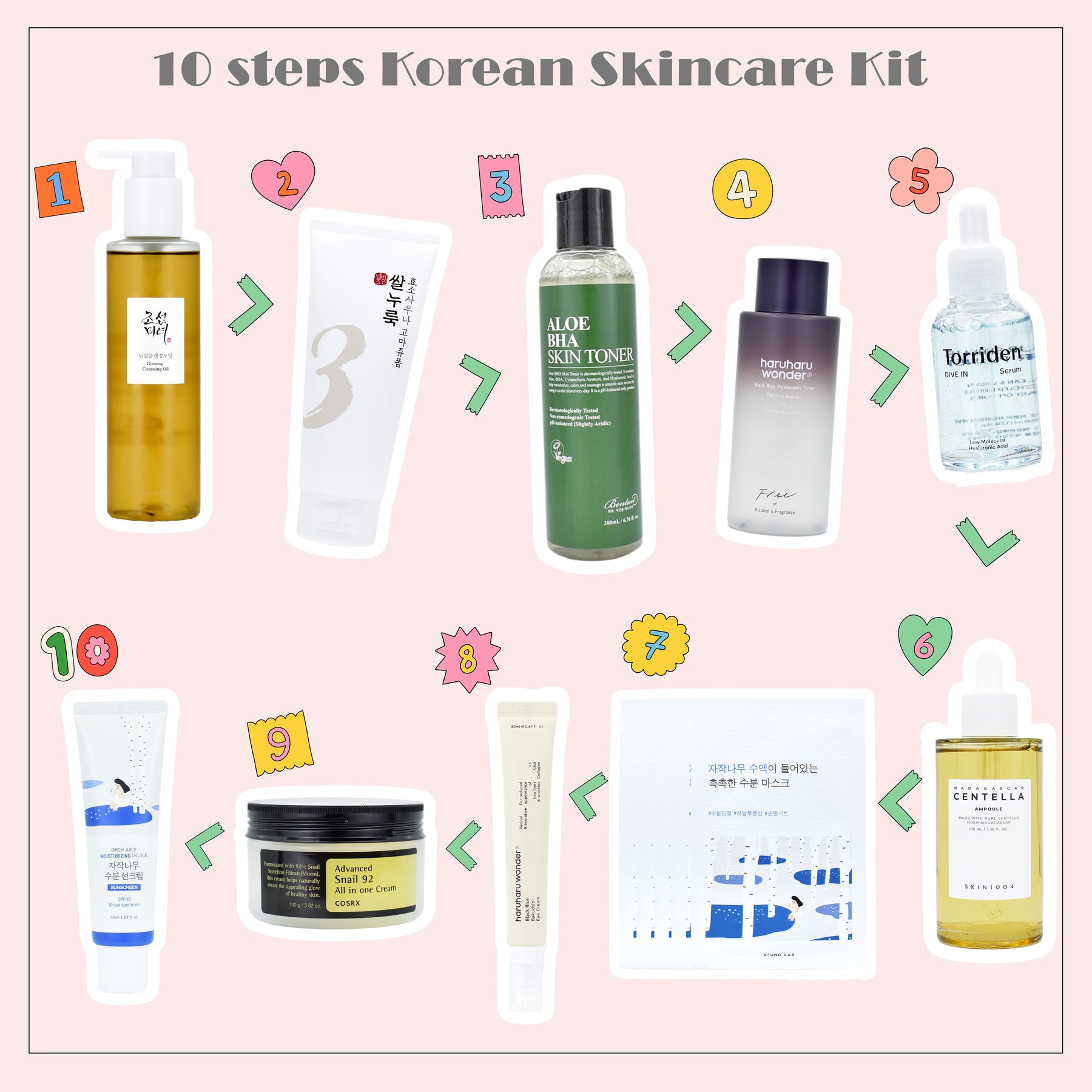 The 10 step Korean skincare routine bundle is a curated ritual featuring ten essentials that bring structure and balance to daily care. Start with the Beauty of Joseon Ginseng Cleansing Oil to remove makeup and sunscreen, followed by numbuzin No.3 Rice Enzyme Skin Softening Cleansing Foam for a refreshing water-based cleanse. Prep skin with Benton Aloe BHA Skin Toner to gently exfoliate and refine, then layer hydration with Haruharu WONDER Black Rice Hyaluronic Toner Fragrance Free. Treatments include Torriden DIVE-IN Low Molecule Hyaluronic Acid Serum and SKIN1004 Madagascar Centella Asiatica 100 Ampoule to boost hydration and resilience. The Round Lab Birch Juice Moisturizing Mask delivers a surge of moisture, while the Haruharu WONDER Black Rice Bakuchiol Eye Cream targets fine lines around the eyes. Lock in nourishment with Cosrx Advanced Snail 92 All In One Cream and finish strong with Round Lab Birch Moisturizing Sunscreen UVLock for complete daytime protection. Together, this sequence embodies the essence of K-beauty layering for healthy, luminous skin.